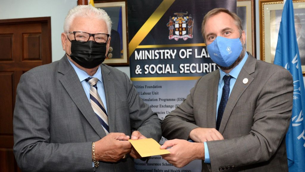 Minister of Labour and Social Security, Karl Samuda, was presented with a symbolic cheque by Head of Office at WFP, Regis Chapman, during a brief ceremony at the New Kingston offices of the National Insurance Fund (NIF) on Tuesday, November 16.