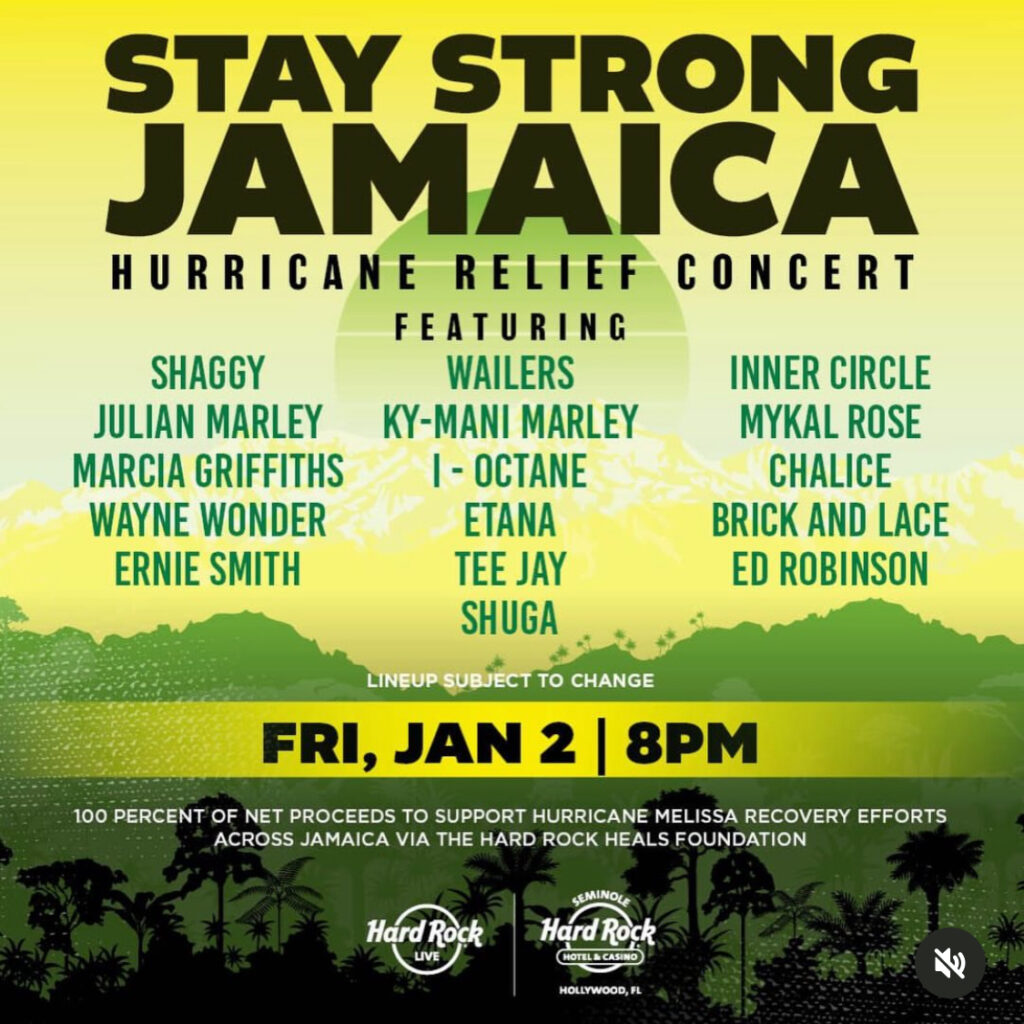 2026 is set to be a year of renewed strength and continued hope from the entertainment world, which will continue its global support of Jamaica’s recovery effort with a planned major relief concert titled “Jamaica Strong” set for the Hard Rock Hotel in Hollywood, Florida, on January 2.