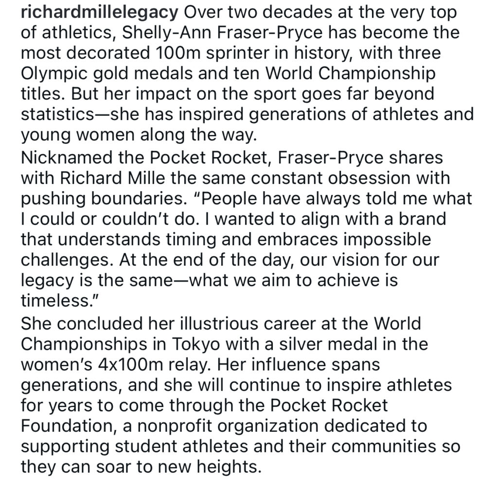 Luxury watchmaker Richard Millie has added its voice to the list of major global brands to salute the Legendary Sprint icon Shelly-Ann Fraser-Pryce following her recent retirement from Athletics.